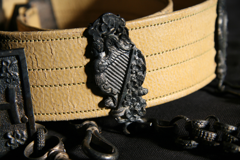 Although the suit of the uniform did not survive the years in an unstable Milwaukee attic, the felt-based hat, belt with decorative buckle, cuffs, sword, and cloth gloves remain intact to this day.